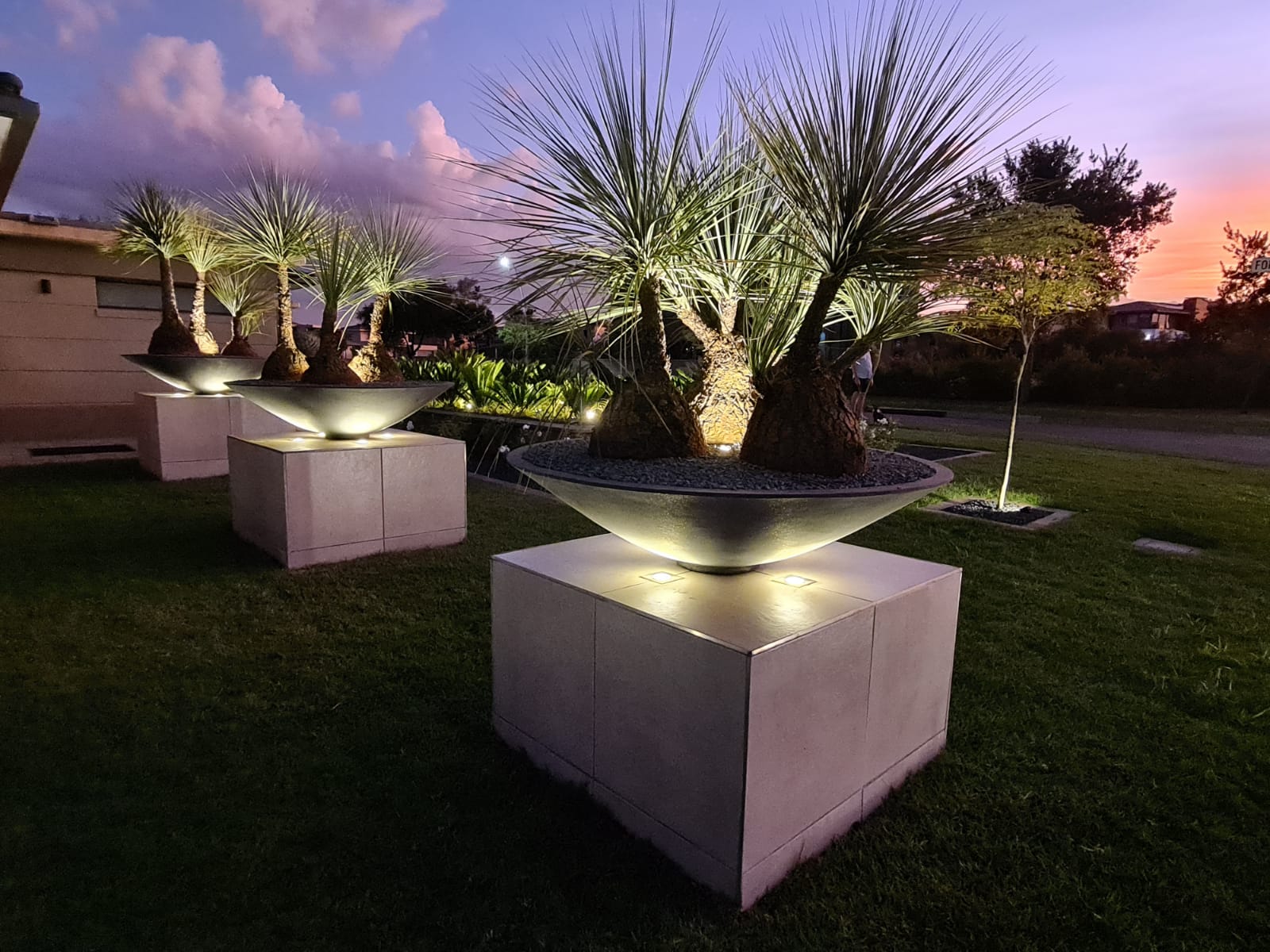 The Rio Bowl creates drama and romance. Three Rio Medium Bowls in Charcoal take centre stage on 1200mm x 1200mm plinths in this dramatic landscape design. We love the way our Manhattan Pots in Charcoal have been used to flank the front entrance at the same project.
