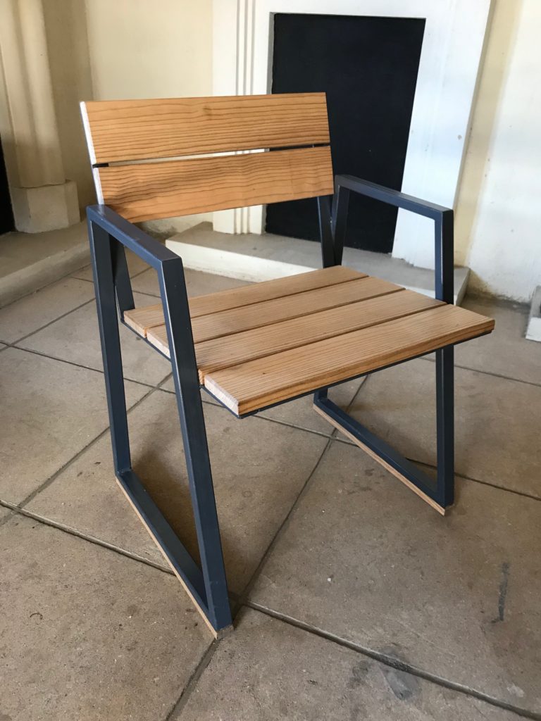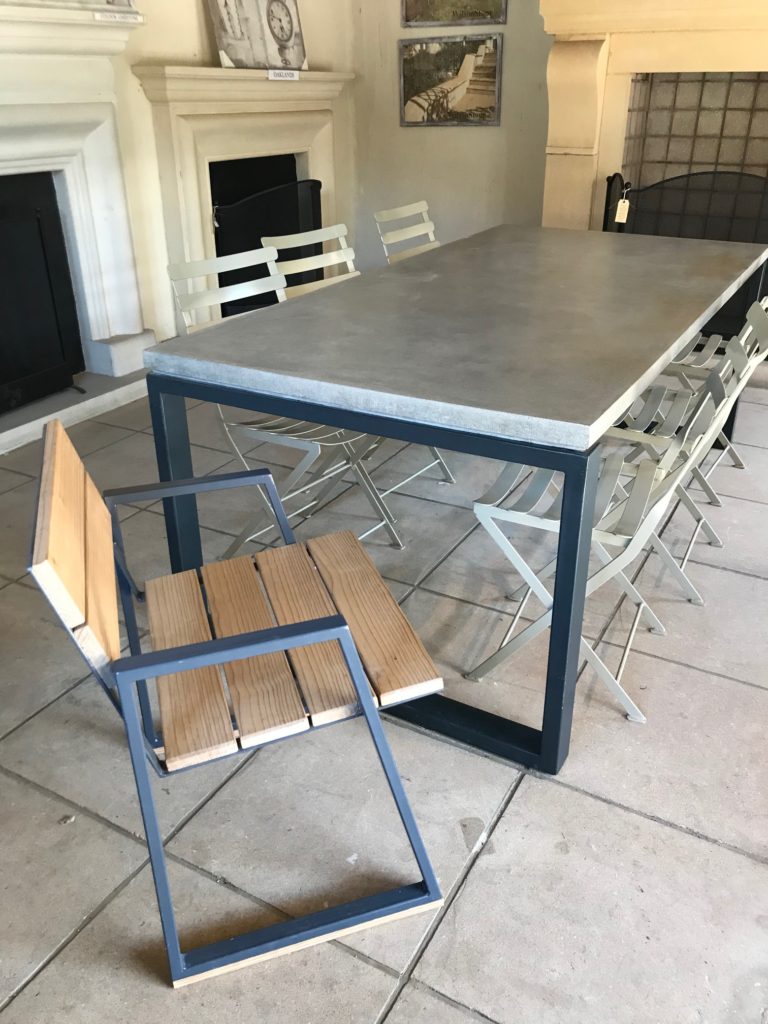 We are proud to introduce our contemporary new outdoor table. This beautiful, hard wearing GRC table top compliments an elegant steel base. At 2100mm x 900mm, the table is a comfortable eight seater. Our new steel and wood chair heads the table, and works in beautifuly with the six French Café Chairs which flank the sides.
