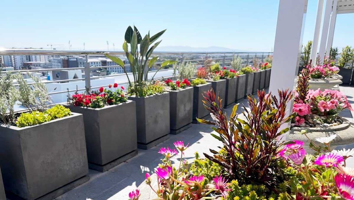 Thirty-nine 500 Cube Pots in Charcoal were beautifully positioned on this roof top garden in Cape Town’s city centre, creating a riot of colour and abundance to frame this beautiful vista. WilsonStone has a huge range of Cubes & rectangular troughs, perfect for creating screens and dividers.
