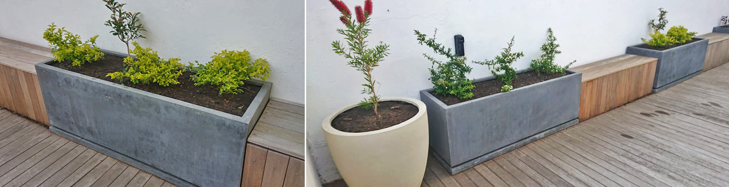 Custom storage units in treated wood were commissioned to compliment our 500 Cube Troughs. A clever use of space and a great way to conceal pool noodles, while creating useful seating by the pool!